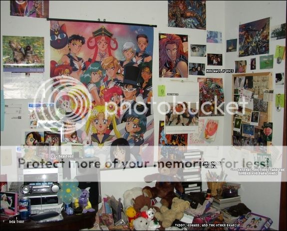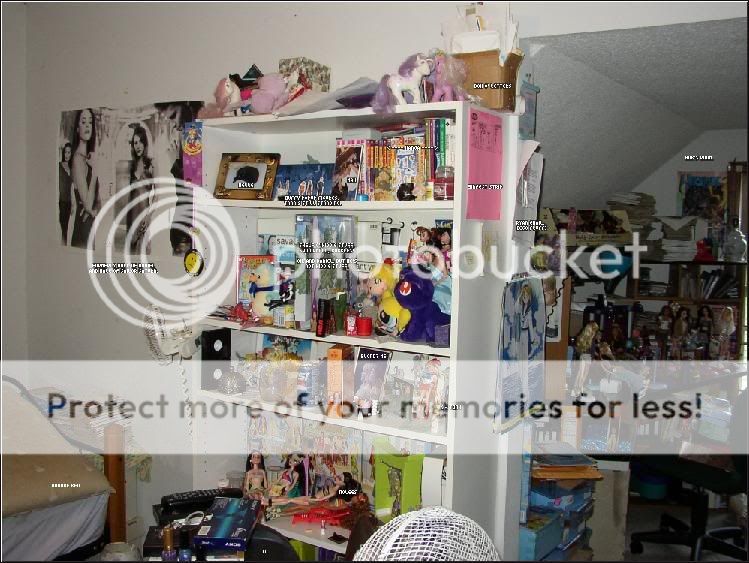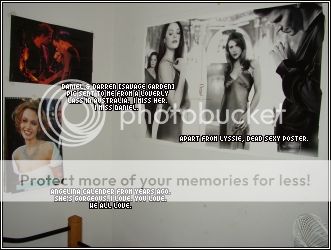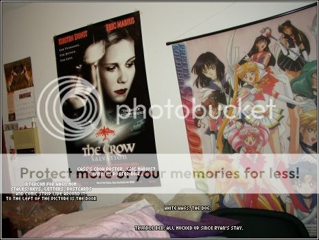 Open zee door and look to your right and we have the wall of weird. Toddle an inch or two up and you can see most of the wall. From this angle you're most likely able to see the back of the door. Woo. To your left would be the closet, but there are no pictures. Turn around and face the room again. Not the door, fool.